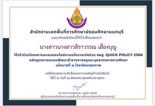 มีการอบรมให้นักเรียนมีคุณธรรมจริยธรรม คุณลักษณะอันพึงประสงค์และค่านิยมที่ดี ส่งเสริมคุณลักษณะที่ดีของผู้เรียน ให้มีความรับผิดชอบในการส่งภาระงาน มีความซื่อสัตย์ต่อตนเองในการทำงานและทดสอบความรู้ด้วยตนเอง